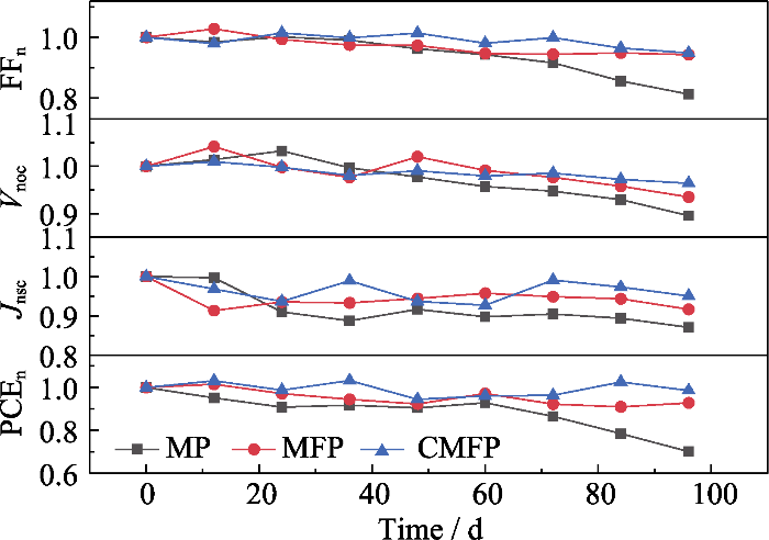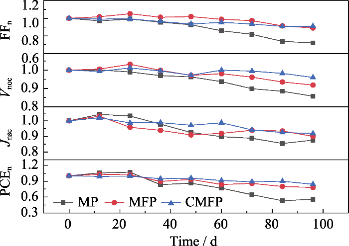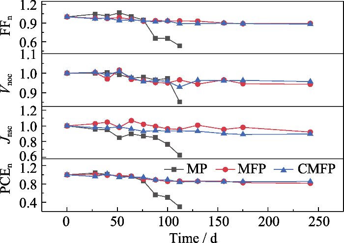 表S6给出了长期稳定性测试结束后各PSCs的J-V相对参数值, MP PSCs放置112 d后PCEn为0.30, MP PSCs的FF和Jsc显著下降, 尤其是FFn为0.54。MFP PSCs放置242 d(5808 h)后, PCEn为0.81, 表明掺入FA+后器件的稳定性可以得到显著改善。CMFP PSCs在测试结束时, PCEn最高, 为0.85, 主要原因是加入Cs+明显延缓了Voc、FF和Jsc衰减。