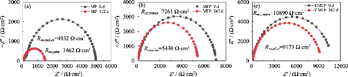 (a) MP、(b) MFP、(c) CMFP钙钛矿太阳能电池在(20±5) ℃, 相对湿度<5%条件下老化前后的暗态EIS图谱