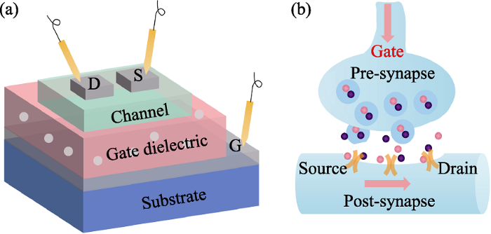 双电层突触晶体管(a)和生物突触(b)的示意图