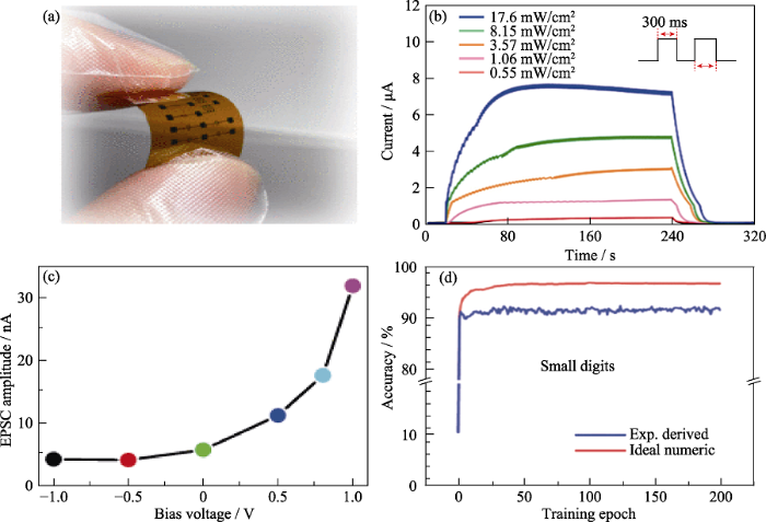 (a) Image of In2O3 nanofiber synaptic transistor on PI substrate[29]; (b) Optical response of EPSC triggered by different light intensities[30]; (c) Relationship between amplitude of EPSC response to presynaptic peak (2.0 V, 25 ms) and gate pressure[31]; (d) Accuracy of simulated neural network for pattern recognition of MNIST small digit (8×8 pixels) database[29]; Colorful figures are available on website