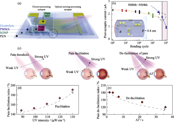 (a) Schematic diagram of a synaptic transistor constructed on a PEN substrate; (b) Variation trend of the postsynaptic current with the number of bending, and curvature radius at 0.8 cm during the test; (c) Schematic diagram of a pain perception model caused by UV stimulation; (d) Pain facilitation index increased with the increase of UV intensity; (e) Change of pain de-facilitation index with ΔT