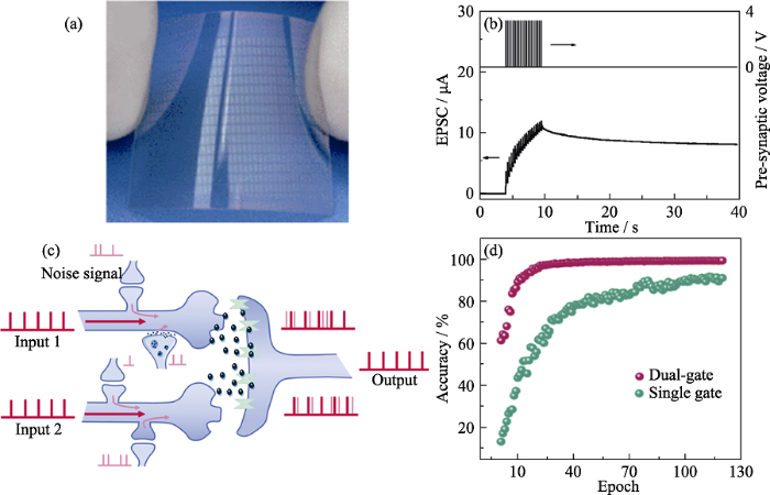 纸作为人类历史上最伟大的发明之一, 一直在人类历史中发挥着重要的作用。随着科技进步, 纸又被开发出了新的功能, 比如作为柔性光电器件的衬底[51-52]。纸衬底具有柔软可弯曲、可循环利用、价格低廉和可生物降解等优异特性。但也有一个致命的缺陷——不耐高温, 所以使用其制备突触晶体管时, 不仅在制备器件过程中, 而且在测试使用过程中, 均以室温下为宜。早在2014年, 就有研究者在纸衬底上构建了突触晶体管[52]。Jiang等[52]以纸为衬底, 制备了以质子酸掺杂的壳聚糖为栅介质, 氧化铟锌(IZO)为沟道材料的突触晶体管。图6(a)展示了该突触晶体管的原理示意图, 图6(b)为纸衬底上弯曲突触晶体管的光学照片。由于具有脉冲电压响应的质子在壳聚糖电介质中的运动, 纸突触晶体管成功模拟了生物突触功能, 包括兴奋性突触后电流、双脉冲易化、动态滤波和时空相关信号处理 (图6(c, d))。他们的研究结果有力地证明了这种纸基突触晶体管不仅对构建廉价和生物友好的人工神经元网络很重要, 而且对实现智能生物材料也很有意义。另外, Wan等[53]也基于纸衬底制备了以SiO2纳米颗粒薄膜为栅介质, IZO为沟道材料的双电层薄膜晶体管, 研究结果表明, 这种柔性IZO晶体管可作为人工突触装置, 并证明了突触的刺激响应和短程突触可塑性功能。这种基于IZO的纸基双电层薄膜晶体管可能在低功率纸电子、柔性人工突触和神经形态系统中有潜在的应用。
