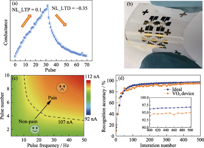 (a) Synaptic plasticity of synaptic transistors constructed on mica substrate[45]; (b) Optical photographs of flexible VO2 transistors constructed on mica substrate; (c) EPSC count chart to assess pain intensity; (d) Simulation identification accuracy of ideal devices and VO2 transistor devices[49]; EPSC: Excitatory post-synaptic current