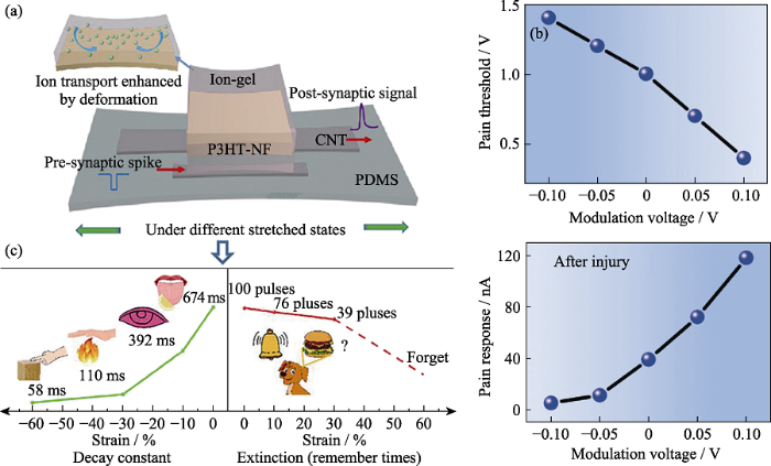 除了上述提到的柔性衬底外, 还有一些自支撑的柔性衬底, 比如PDMS[54]、海藻酸钠膜[55]、壳聚糖[56-57]等。Guo等[54]使用PDMS为衬底, 以P3HT-NF作为半导体演示了可拉伸的有机突触晶体管, 首次研究了在不同变形状态下机械变形对其突触行为的影响。从图7(a)可以明显看出, 可拉伸突触晶体管表现出优异的机械稳定性。他们的研究结果表明, 生物感觉神经元最重要的参数: 突触晶体管的学习、记忆行为和衰减常数, 可以通过机械形变调节, 这与离子凝胶中依赖机械变形的离子传输有关。 这些结果为利用机械变形开发不同功能器件提供了一个很有前途的方向。另外, Wan等[56]在壳聚糖膜上制备了具有双栅结构的IZO神经形态晶体管, 并用于柔性人工痛觉感受器模拟。图7(b)显示了独立人工痛觉感受器在不同调制电压下的疼痛阈值。疼痛阈值可调的人工伤害感受器可以提高周围复杂环境中的检测效率。图7(c)显示了调制电压依赖性疼痛反应。这种疼痛反应可调的人工痛觉感受器可以帮助失去知觉的患者感受疼痛, 也可以帮助对疼痛敏感的人减轻疼痛感。这种独立的仿生装置不仅能将疼痛感知功能捕捉到外周输入, 还可以通过施加在第二栅极上的电压来模拟疼痛敏感性的调制。2021年, Wan等[57]又基于壳聚糖衬底构建了双栅MoS2神经形态晶体管。壳聚糖膜同时用作电介质和基底。该双栅晶体管在柔性壳聚糖膜上不仅表现出较高的机械稳定性和电学性能, 还成功仿真了一些重要的突触功能, 如成对脉冲易化和可调高通滤波器。该结果极大地丰富了二维柔性电子学和神经形态感知系统的研究。最近, Chen等[58]基于PEF(生物基材料)衬底, 制备了一个突触晶体管, 它将光响应从可见光扩展到紫外到近红外光, 并模拟了人类在宽多波长光刺激下的视觉感知、记忆和光学数据处理。该研究不仅展示了生物复合材料在人工突触中的应用潜力, 还可为设计高性能的人工突触光电晶体管提供有效的指导。