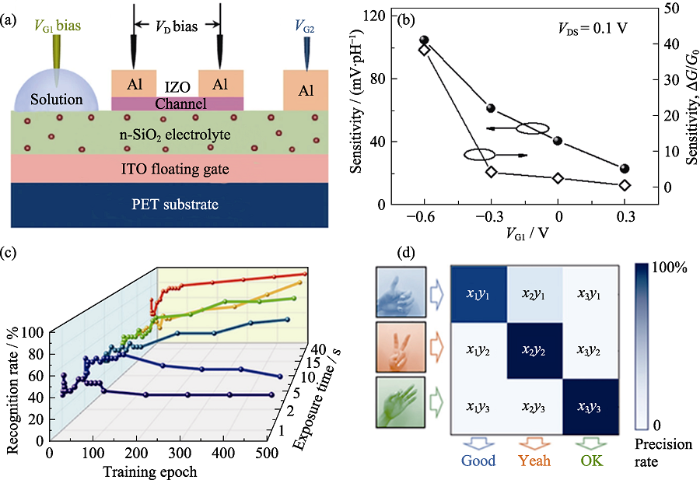 (a) Schematic diagram of IZO-based neuron transistor measurement; (b) pH sensitivity of the device with different VG1[61]; (c) Change of the estimated recognition rate of pattern recognition with the number of training under three conditions according to different exposure time; (d) Classification test confusion matrix under three different conditions ("Good", "Yeah" and "OK") after different exposure time and number of iterations[62]