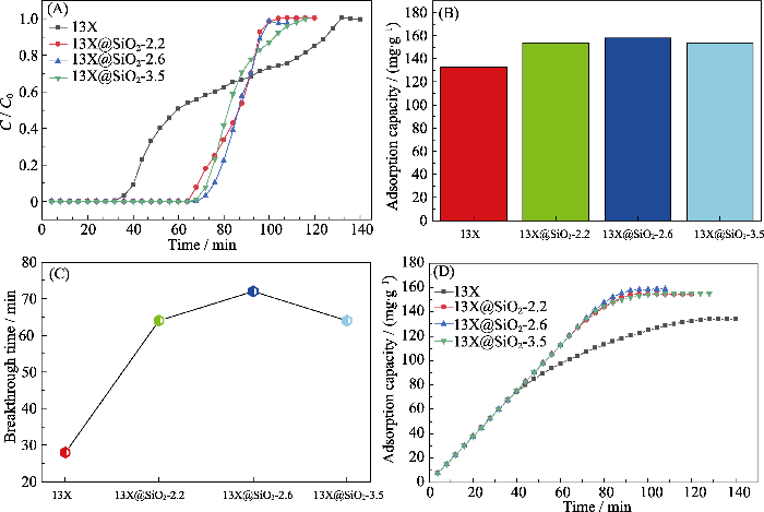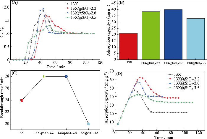 当吸附质中不含水蒸气时, 对甲苯吸附穿透曲线和累积吸附量图如图4和图S6所示, 纯介孔二氧化硅的突破时间为44 min, 饱和吸附量为163 mg/g,优于干条件下13X的饱和吸附量(134 mg/g); 13X@SiO2-v比13X原样具有更长的穿透时间(尾气中探测到明显吸附质时间)和更多甲苯的吸附量。图4(B, D)表明13X@SiO2-2.2、13X@SiO2-2.6、13X@SiO2-3.5的饱和吸附容量分别为154、159和155 mg/g, 比13X(134 mg/g)分别提高了16%、18%、15.8%, 这归因于壳层的影响, 即增加的吸附量应该是壳层增加和13X减少共同作用的结果。从突破时间来看, 甲苯在上述三个样品的突破时间分别为64、72、64 min, 远比13X的(28 min)大(如图4(C)), 表明在相同环境下复合材料比13X对甲苯具有更好的去除效果。对13X@SiO2-v核壳样品而言, 其比表面积和外比表面积的提升, 增大了吸附剂与甲苯之间的范德华作用力[26]。