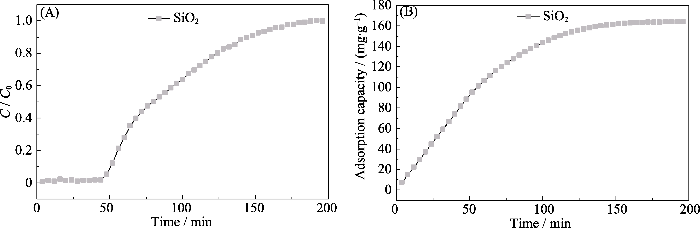 SiO2在干条件下对甲苯的(A)吸附穿透曲线和(B)累积吸附量