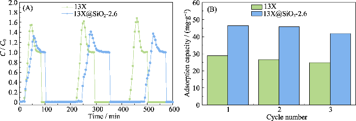 在30%相对湿度下, 所有样品的甲苯吸附量显著下降,穿透时间显著缩短, 这归因于混合气体中的水分子与甲苯竞争吸附剂中的吸附位, 降低了对甲苯的吸附量。对比图4(B)和图5(B)可见, 与核/壳复合样品相比, 达到吸附平衡时13X对苯的吸附量下降更加明显。13X由于硅/铝比小、表面亲水的特性, 造成在水汽-甲苯对吸附位的竞争过程中, 甲苯处于劣势。与干条件相比, 在30%相对湿度下, 13X沸石对甲苯吸附量下降了79%; 由图5(B)还可知, 30%相对湿度环境下, 13X、13X@SiO2-2.2、13X@SiO2-2.6、13X@SiO2-3.5对甲苯的吸附容量分别为28、34、43和35 mg/g, 其中13X@SiO2-2.2和13X@SiO2-2.6比13X分别提高21%和53%。三个复合样品中13X@SiO2-2.6的饱和吸附量最高, 这是因为它具有最好的表面疏水特性(图S5)。