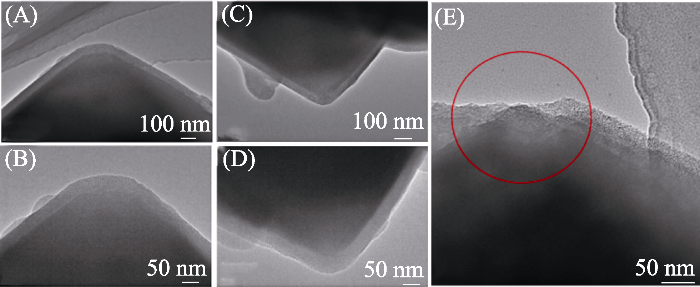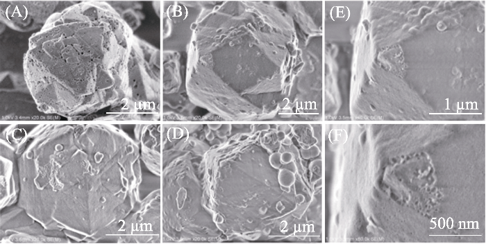 图2为13X及13X@SiO2-v的SEM照片。从图2(A)中可以看出, 13X原样具有“孪生”的八面沸石的形状, 晶体颗粒尺寸约为2~3 μm, 表面粗糙。13X@SiO2-v的外表面较为光滑, 且晶粒尺寸随正硅酸乙酯用量增大而明显增加, 这是由13X外表面沉积了一层二氧化硅(即MCM-41壳层)导致。图2还表明随正硅酸乙酯用量增大, 除13X外表面由粗糙变得光滑外, 样品中还出现了游离的球状小颗粒, 这归因于过量二氧化硅形成的硅微球。且随着正硅酸乙酯用量增大, 硅微球的粒径逐渐增大, 说明13X外表面的MCM-41层的厚度不能无限增厚。 图2(E, F)为样品13X@SiO2-2.2晶粒表层局部破损的SEM照片, 可以看见破损处壳层厚度大约为50 nm。由图S2样品EDS分析结果可见, 13X、13X@SiO2-2.2、13X@SiO2-2.6和13X@SiO2-3.5样品的Si/Al分别为1.10, 1.20, 1.45和1.45, 进一步表明正硅酸乙酯水解后在13X表面沉积了一层介孔二氧化硅。