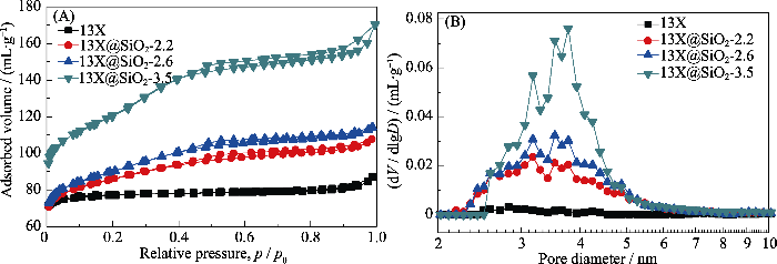 通过控制正硅酸乙酯的水解在13X表面沉积了一层介孔二氧化硅, 并得到了具有核壳结构的13X@SiO2复合分子筛: