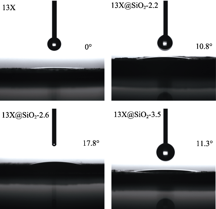 图S4为13X@SiO2-v与13X沸石的红外光谱图。由图可见13X沸石在3450 cm-1附近处的红外吸收峰归属于Si-OH的伸缩振动吸收峰, 457、681和981 cm-1处的红外吸收峰归属于13X沸石内部的铝氧四面体和硅氧四面体的振动峰。图S4还表明经MCM-41包裹后, 样品的Si-OH伸缩振动吸收峰向低波数偏移至3447 cm-1处, 这是由材料的疏水性增加, 与水的结合变弱引起[25]。水接触角大小可以直接反映材料外表面的疏水性强弱。如图S5所示, 水滴在13X沸石表面没有凝结, 因为水一接触13X表面就被吸附, 说明13X具有很强的亲水性。13X@SiO2-v系列核壳复合材料对水滴没有立即吸收, 虽然核壳材料表面水接触角都小于90°[12,14,16,22], 但表面水滴均表现出一定程度的凝聚。上述结果说明, 与13X沸石相比, 13X@SiO2-v系列核壳复合材料的疏水性得到一定程度的提高, 其中13X@SiO2-2.6的水接触角最大, 达到17.8°, 13X@SiO2-2.2和13X@SiO2-3.5的相近但比13X@SiO2-2.6接触角小。