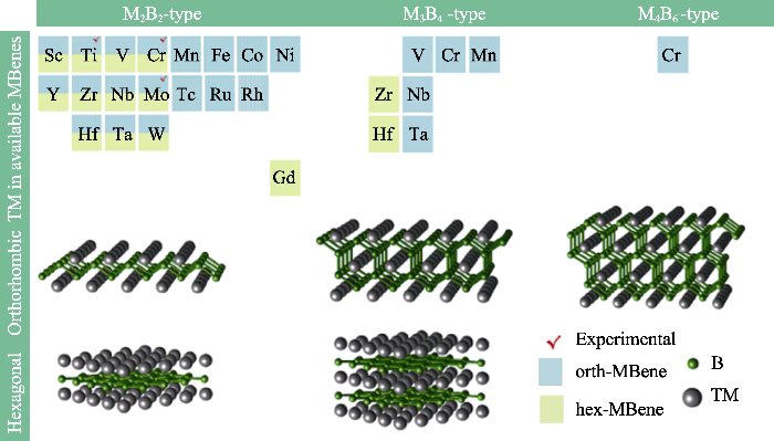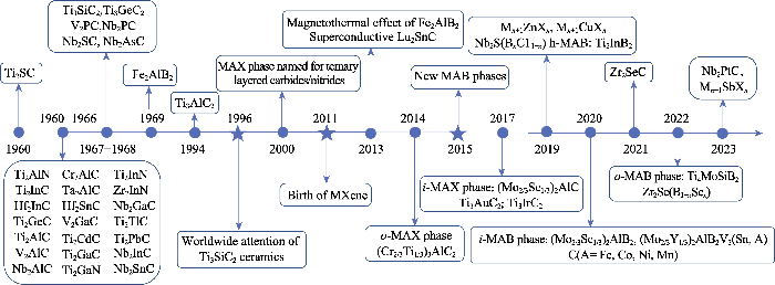 In 1960, Ti2SC was synthesized[40]; From 1960 to 1966, a large number of ternary layered carbides/nitrides (H-phases) with an M2AX formula (211 type) were synthesized[41-42]; From 1967 to 1968, Ti3SiC2 (312 type) and a set of 312 and 211 types H-phases were produced[41,43-44]; In 1969, a typical ternary layered boride Fe2AlB2 was synthesized[7]; In 1994, Ti3AlC2 was discovered[45]; In 1996, the high purity Ti3SiC2 was produced and exhibited excellent properties, thus triggering the research upsurge to these materials[46]; In 2000, Barsoum[1] renamed H-phases as Mn+1AXn phases, short for MAX phases; In 2011, the first MXene Ti3C2Tx was discovered[28]; In 2013, the discovery of magnetocaloric effect of Fe2AlB2 raised research upsurge on ternary layered borides[9]. Also, Lu2SnC was synthesized and found to be superconducting[47]; In 2014, an o-MAX (Cr2/3Ti1/3)3AlC2 was synthesized[48]; In 2015, ternary layered borides were named as MAB phases. In addition, the first Zr-based MAX phase was discovered[10,49]; In 2017, an i-MAX (Mo2/3Sc1/3)2AlC and two noble-metal MAX phases Ti3AuC2 and Ti3IrC2 were synthesized[22,50]; In 2019, a series of MAX phases containing Cu and Zn, and a hexagonal MAB phase Ti2InB2, as well as Nb2SBxC1-x (x=0-1) were synthesized[24⇓-26,51,52]; In 2020, two i-MAB phases (Mo2/3Sc1/3)2AlB2 and (Mo2/3Y1/3)2AlB2, as well as a variety of MAX phases containing Fe, Co, Ni, and Mn were synthesized[16,19]; In 2021, MAX phases having Se atoms at the A-site were produced[53]; In 2022, o-MAX phase Ti4MoSiB2, the first MBene, and Zr2Se(B1-xSex) were synthesized[20,54-55]; In 2023, a chemical scissor-mediated structural editing strategy was proposed, which extremely expands the diversity of MAX phases and MXene[56]
