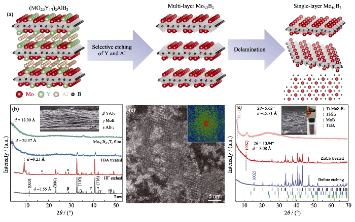 ... [55]; (c) STEM image of monolayer Mo4/3B2-xTz and its FFT image (inset) [55]; (d) XRD patterns of o-MAX Ti4MoSiB2, product etched by ZnCl2 and two-dimensional TiOxCly after delamination and filtering with SEM image (inset) of cross-sectional morphology of a TiOxCly film[54] ...