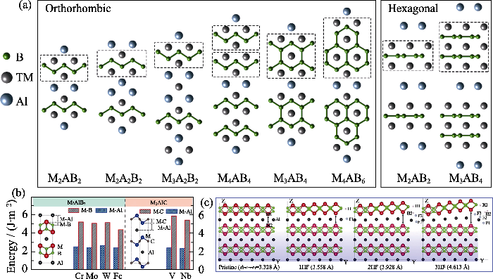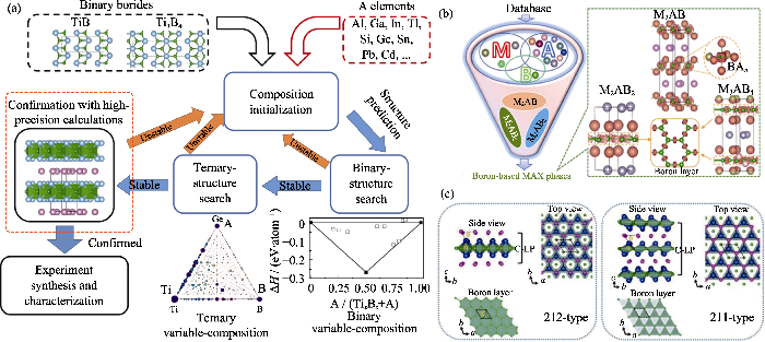 (a) Calculation-based approach to discovery of novel ternary phases Ti2InB2[52]; (b) High-throughput prediction of MAB phases[162]; (c) Crystal structures for the stable Nb2AB2 and Nb2AB (A: P or S)[183]