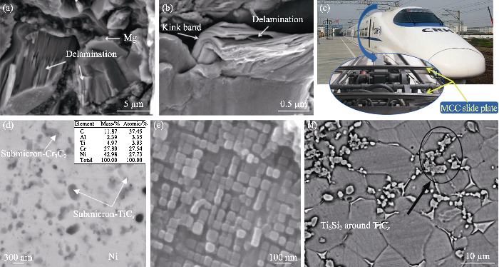... (a-b) Fracture morphology of MAX in Mg matrix composites undergoing microplastic deformation[213]; (c) MAX/Cu matrix composite MCC pantograph slide plate[215]; (d, e) Transformation of MAX to TiCx and Cr3C2 in Ni matrix composites and morphology of in situ authentic γ'[224]; (f) Morphology of the MAX transformation to TiCx and Ti5Si3 in Ti matrix composites[225] ...