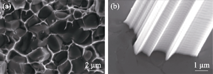 (a) Fractured Zr2InC surface showing In at grain boundaries (this surface being covered with thin In film); (b) An In whisker whose cross-sectional shape is determined by grain boundary geometry at the In/Zr2InC interface