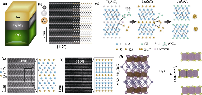 (a) Schematic illustration of Ti3SiC2 film covered by Au film on the SiC substrate[22]; (b) STEM image of Ti3SiC2 and its corresponding atomic model[22]; (c) Schematic illustration of preparing novel MAX phases and MXene based on a Lewis-acidic-molten-salt route[24]; (d) STEM image of Ti3ZnC2 and its corresponding atomic model[24]; (e) STEM image of Ti3C2Cl2 and its corresponding atomic model[24]; (f) Schematic illustration of the conversion from non-van der Waals solids to 2D transition-metal chalcogenides[57]