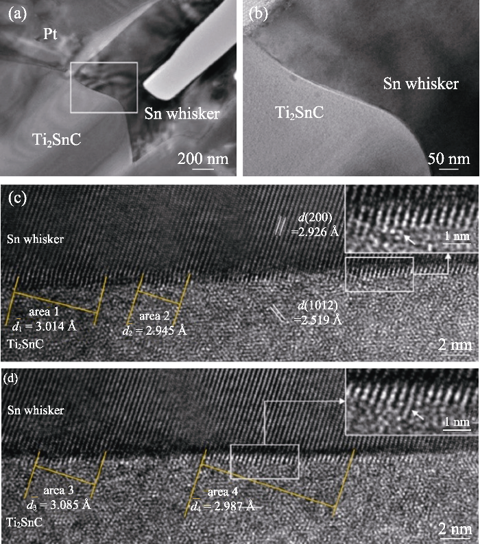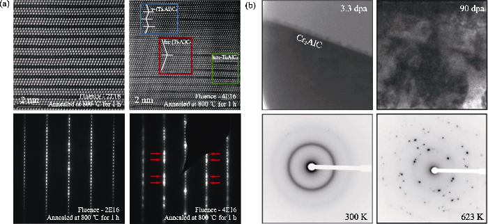 (a) Ti3AlC2 is completely recovered to initial phase (a dose of 2×1016 cm-2) or partially recovered to initial phase and γ-Ti3AlC2 phase (a dose of 4×1016 cm-2) after irradiation with 1 MeV Au ions and then annealed at 800 ℃ for 1 h[303]; (b) Cr2AlC films showing completely amorphous after irradiation with 320 keV Xe ions up to 3.3 dpa at 300 K, but not completely amorphized after irradiation up to 90 dpa at 623 K[306]