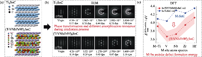 (a) Schematic of atomic structure models of Ti2SnC and (TiVNbZrHf)2SnC; (b) In-situ selective area electron diffraction (SAED) micrographs of Ti2SnC and five-component (TiVNbZrHf)2SnC recorded during 800 keV Kr2+ irradiation, showing different phase transformation process and amorphization resistance; (c) M-Sn antisite defect formation energies calculated via DFT in the corresponding single-component M2SnC and the five-component (TiVNbZrHf)2SnC supercell