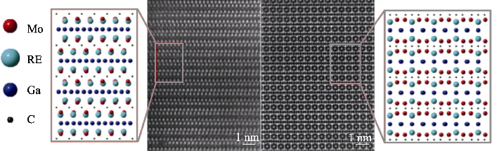 一系列新型MAB相固溶体则是该领域另一值得注意的进展。该固溶体包括面内有序的i-MAB相(in-plane ordered MAB phases)和面外有序o-MAB相(out-of-plane ordered MAB phases), 进一步丰富和扩展了MAB相化合物的数量, 展现出MAB相材料优异的结构和性能可调控性。这些固溶体可分为在M位、A位的无序固溶, 如(Mo1/2W1/2)AlB[142]、(Fe1/2Mn1/2)2AlB2[143]、(Mn1/3Cr2/3)3AlB4[144]、(Fe4/5Mn1/5)5SiB2[135]和MoAl0.97Si0.03B[145]等。i-MAB相的两种M位原子均占据同一平面并有序固溶, o-MAB相的两种M位原子则分别占据不同平面。Rosen等[55]合成了i-MAB相(Mo2/3A1/3)2AlB2 (A = Y, Sc)(图9(d~f))和o-MAB相Ti4MoSiB2(图9(g~i)), 并利用高分辨扫描透射电镜技术确认其原子结构[54]。以(Mo2/3A1/3)2AlB2 (A = Y, Sc)为前驱体成功刻蚀出了对应的二维材料Mo4/3B(图10), 通过实验证实存在二维MBenes[55,146]。总的来说, MAB相及其固溶体在化学成分和结构上的多样性为下一步的性能调节和实际应用提供了广阔的选择空间。