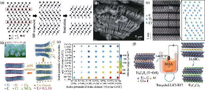 (a) Schematic illustration of preparing MXene using HF solution as etchant[28]; (b) SEM image of Ti3C2Tx prepared by HF solution, showing the typical accordion-like morpholorgy of MXene particle[28]; (c) STEM image of Ti3C2Cl2 prepared by Lewis-acidic-molten-salt route, and its corresponding atomic model[24]; (d) Schematic illustration of preparing Ti3C2Tx MXene via a reaction between Ti3SiC2 and CuCl2; (e) Redox potential/Gibbs free energy between Lewis acid cations and A-site atoms in molten salts[30]; (f) Schematic illustration of the electrochemistry etching strategy for the preparation of MXene in molten salt[72]