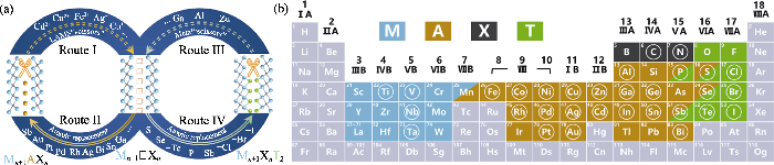 (a) Schematic illustration of chemical intercalation strategy aided by chemical scissors[56]; (b) Periodic table showing elements involved in the formation of MAX phases and MXenes. Light blue: M elements; Brown: A elements; Black: X elements; Green: ligand (T) elements; Circled: elements studied in the present work[56]