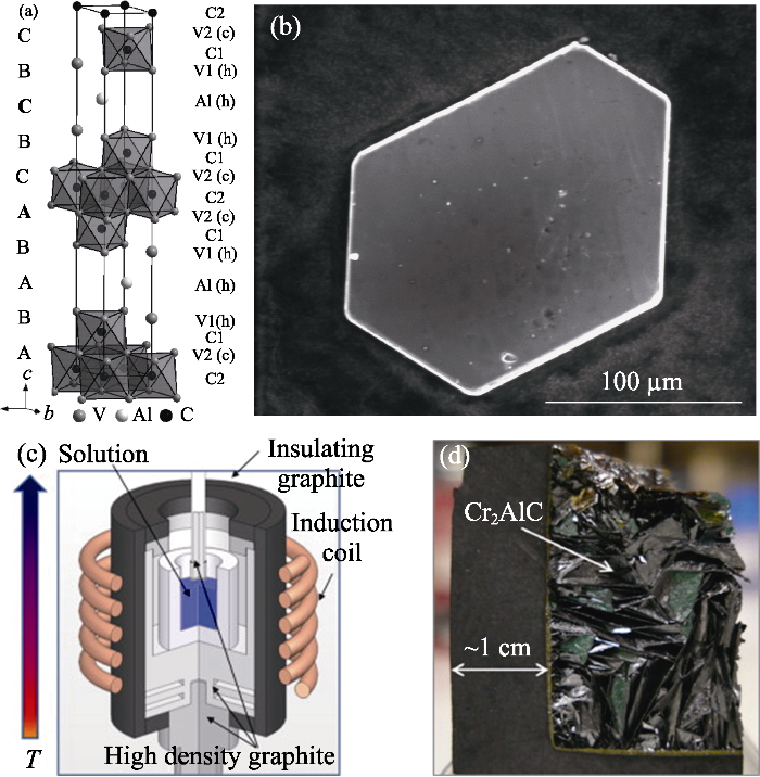 (a) Crystal structure of V4AlC3-x[106]; (b) SEM image of single MAX phase V4AlC3-x[106]; (c) Schematic of the experimental set-up used for high temperature solution growth[107]; (d) Photograph of part of the crucible cut after growth and dipping into dilute HCl, the Cr2AlC platelets are coalescing due to an unusually long growth time[107]