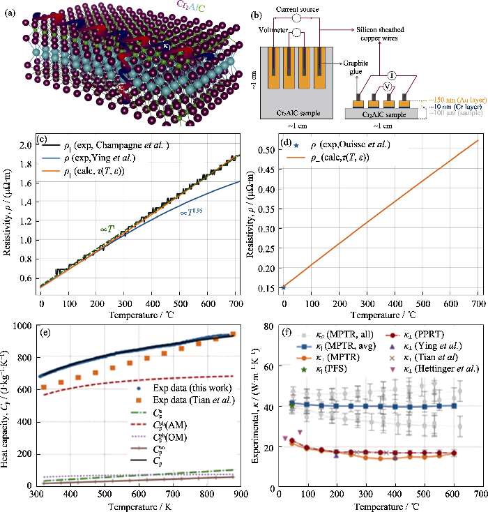 (a) Atomic structure model of Cr2AlC; (b) Schematic of the in-plane resistivity measurements in Cr2AlC using a four-probe configuration with equidistant and parallel pads; (c) Temperature-dependence measurements of the in-plane resistivity for Cr2AlC single crystals (black line); (d) Predicted out-of-plane resistivity (orange line); (e) Heat capacity measurements of Cr2AlC single crystals measured experimentally (blue dots); (f) Measured in-plane (κ∥) and out-of-plane (κ⊥) thermal conductivities using various techniques ...