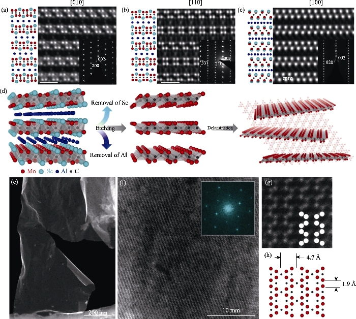 (a-c) i-MAX with in-plane chemical order, viewed from [100], [010] and [110] zone axes, respectively; (d) Schematic of the conversion from i-MAX to i-MXene; (e) Low-magnification STEM image of single flake of Mo1.33C i-MXene; (f) Higher magnification STEM image with the FFT result of Mo1.33C i-MXene; (g) Atomically resolved STEM image of Mo1.33C i-MXene; (h) Atomic structure model corresponding to (g)