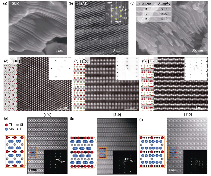 (a) SEM image of layered Ti2InB2; (b) STEM image of Ti2InB2 along the direction of [001] and corresponding FFT result in the inset image; (c) SEM image of 2D-TiB and its corresponding EDS semi-quantitative resultin inset table[52]; (d-f) STEM images of i-MAB phase (Mo2/3A1/3)2AlB2 and corresponding atomic model along the direction [0001], [$1\bar{1}00$] and [$11\bar{2}0$], respectively, and their corresponding FFT images[55]; (g-i) STEM images of o-MAB phase Ti4MoSiB2 and corresponding atomic model along the direction [100], [210] and [110], respectivly, and their corresponding FFT images[54]